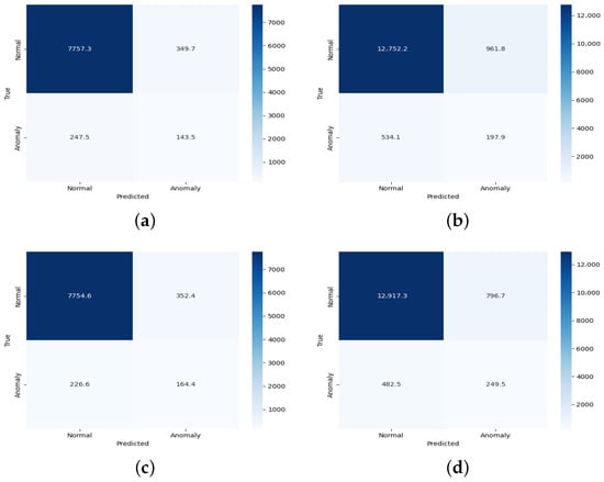 The data, after being separated into normal (“positive”) and anomalous (“negative”) labels, which are blue and red, respectively, can be seen in Figure 4a.