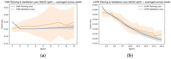 Training Regime Both models were trained using the Adam optimizer with a focal loss function [78], where is dynamically set based on the proportion of positive labels in the training split and . Early stopping was applied with a patience of 8 epochs, restoring the best-performing weights. Models were trained with a batch size of 64 and multiple random seeds (0–9) to ensure reproducibility and reduce variance in reported performance. Class imbalance was addressed via upsampling of the positive class within each training split.