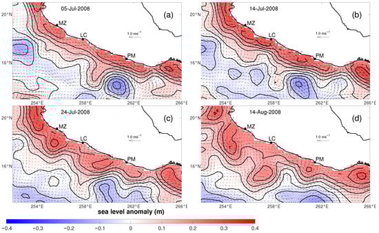 During the processing and visual inspection of the daily geostrophic velocity fields, we noted the appearance of numerous small eddies that resemble current instabilities, similar to those reported by [20,21]. A closer examination shows that these eddies consistently form between the coastal jet and the shoreline at three specific locations in the SMP: off Manzanillo (MZ), off Lázaro Cárdenas (LC) and off Punta Maldonado (PM). This generation process differs from those described by the earlier studies, which focused on larger instabilities farther offshore; here the eddies originate within coastal concavities. Figure 4 illustrates the evolution of the current and eddies during July–August 2008 as an example. On 5 July the poleward phase of the coastal current is well developed (Figure 4a). By 14 July anticyclonic recirculations begin to form at MZ, LC and PM (Figure 4b). Ten days later, at 24 July (Figure 4c) a well-defined anticyclonic eddy has developed off MZ and a weaker eddy off PM. By 14 August (Figure 4d) the MZ eddy has moved offshore and the PM eddy has intensified. A larger eddy centred near 257° W, 15.5° N appears to have originated from LC. Similar sequences occur during other years and during both phases of the current, indicating that near-shore eddy formation is a recurrent feature.