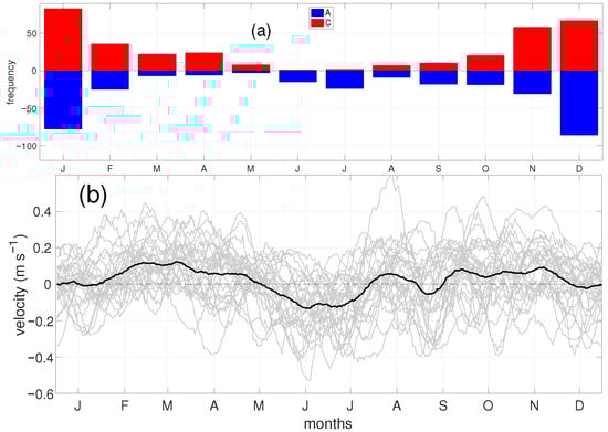 (a) Monthly climatology from 1993 to 2021 of emerged cyclon/anticyclon eddies in red/blue. (b) Annual time series of component velocity along the coast for each year (gray) and daily climatology from 1993 to 2021.
