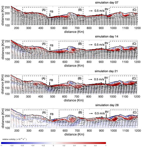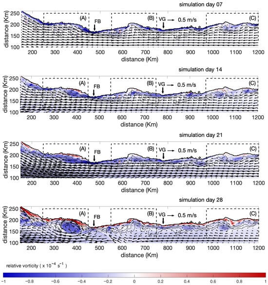 The POM simulations demonstrate that the imposed coastal current undergoes systematic separation from the coastline as it intensifies, particularly at the three major concave headlands of the region. Figure 8 and Figure 9 show the velocity (black arrows) and vorticity (colored tones) maps for the two simulations. Each figure displays four panels for simulation days 7, 14, 21, and 28, from top to bottom. Within each panel, the concave zones for MZ (A), LC (B), and PM (C) are delimited by rectangles with dashed lines. Also included in each panel are headland markers or points called Faro de Bucerías (FB) and Puerto Vicente Guerrero (VG). During the phase of maximum alongshore velocity, the current detaches approximately 36 km offshore at MZ, LC, and PM, creating a dynamically favorable zone in which recirculation can initiate. This behavior is consistent with theoretical and numerical studies demonstrating that rotating coastal flows tend to overshoot concave or corner-like geometries, leading to the formation of recirculation zones in the lee of the separation point [22,23,24].