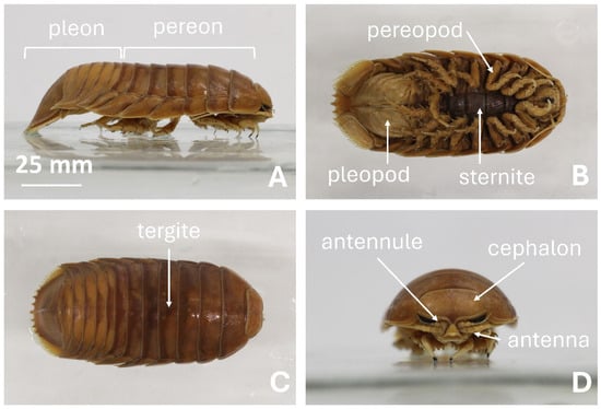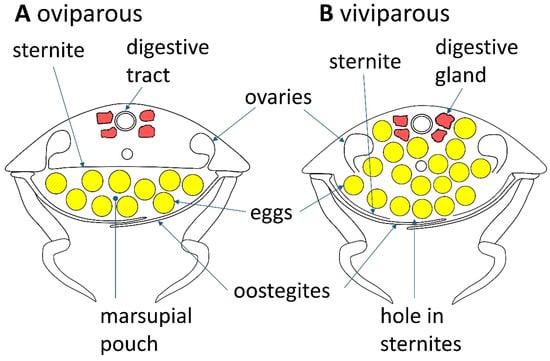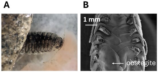 - Warburg, M.R.; Rosenberg, M. Brood-pouch structures in terrestrial isopods. Invertebr. Repr. Dev. 1996, 29, 213–222. [Google Scholar] [CrossRef]