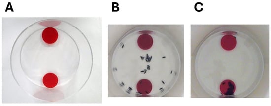 Members of one species of cirolanid, C. harfordi, have been shown to be social animals and this social behaviour may help them form efficient predatory swarms [75,76]. Since 1976 it has been recognised that members of this species form aggregates in their natural environment [77,78]. For some years, however, the question remained, were these animals aggregating in common areas due primarily to an attraction to available resources such as food and water [79] and simply tolerating each other’s proximity? Or did they actively seek out each other’s company for reasons other than mating? These questions were answered using a binary choice arena (see Figure 5), a piece of equipment that had been developed for studying social behaviour in terrestrial isopods and which consisted of a 200 mm diameter acrylic cylinder open at the top with two shelters at opposite sides of the arena [75,80,81,82,83]. The shelters were made of red-coloured acrylic discs of 50 mm diameter that were attached so that there was a 6 mm space underneath them to allow isopods to take shelter there. Specimens of C. harfordi were initially placed at the centre of the arena in a temporary holding container made from a plastic cylinder. The temporary holding container was removed at the start of the experiment releasing the animals and their movements were filmed from overhead for 60 min. In most of these experiments the animals, as a group, picked one of the shelters at random and preferentially aggregated there [75]. These results demonstrated the animals’ desire to seek out the company of conspecifics, thus showing social behaviour. The shelter preferred by the group of specimens was referred to as the “winning shelter” and the other termed the “losing shelter” [75,84].