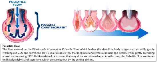 This diagram depicts pulsatile flow created by the HFPV at the alveolar level and how it aids in alveolar recruitment and debris mobilization.