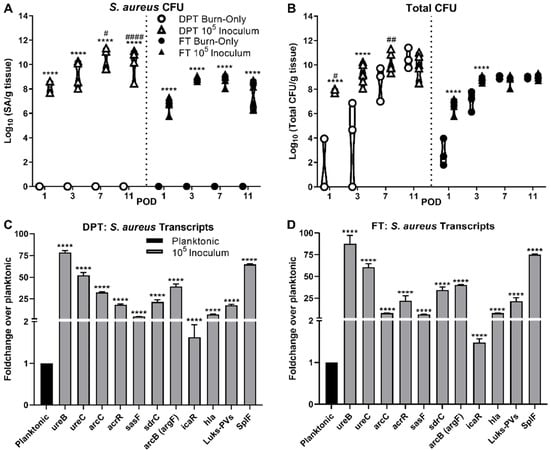 Bioburden and gene transcriptional analysis within DPT and FT Burn Wounds. S. aureus dominates the wound bed for both DPT and FT burn wounds relative to the total bioburden, based on viable CFU counts (A and B, **** p < 0.0001, compared to burn-only). Despite the lack of inoculation with S. aureus, there is still a clear increase in bioburden from the native flora (B). DPT burn wounds had significantly more S. aureus present at PODs 7 and 11, compared to FT infected burn wounds; as well as overall bioburden at PODs 1 and 7 (# p < 0.05, ## p < 0.01, #### p < 0.0001). Transcriptional analysis of genes related to biofilm processes of S. aureus were upregulated in both DPT (C) and FT (D) burn wounds at POD 3, with the exception of icaR, which is a suppressor of the ica genes. Transcriptional values are represented as the average fold-change over planktonic cells ± standard deviation. Transcriptional differences were based on normalized values of planktonic and burn wound isolated cells (**** p < 0.0001).