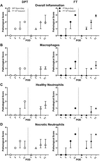 Pathological assessment of DPT and FT burn wounds. Pathological assessment revealed overall greater inflammation in FT burn wounds, with or without S. aureus infection (A). Macrophages remained unaffected by S. aureus infection (B). Healthy neutrophils trended slightly higher at POD 7 in DPT burn wounds infected with S. aureus, while necrotic neutrophils trended slightly higher in FT burn wounds (C). S. aureus also appeared to result in a slightly faster generation of necrotic neutrophils in FT burn wounds at POD 3 (D). Pathological scores are represented as the median with interquartile ranges.