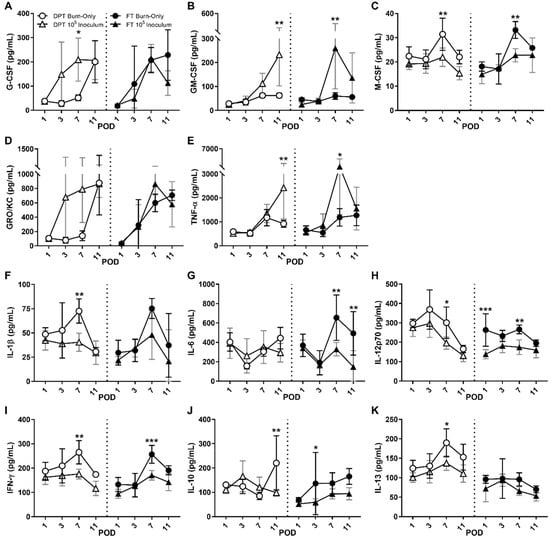 A dynamic cytokine and chemokine response was seen with respect to S. aureus infection at 105 inoculum within both burn wound scenarios. Significant increases in granulocyte (G-) and granulocyte macrophage colony stimulating factors (GM-CSF) were seen in DPT and/or FT burn wounds, while macrophage colony stimulating factory (M-CSF) was suppressed, relative to burn-only (Figure 4A–C). Among pro-inflammatory markers, only human-growth regulated onco-gene/keratinocyte chemoattractant (GRO/KC, i.e., CXCL-1, an IL-8 related chemokine) and tumor necrosis factor-alpha (TNF-α) were elevated in both DPT and FT burn infections compared to burn-only (Figure 4D,E). All others, including IL-1β, IL-6, IL-12p70, and IFN-γ, were significantly suppressed at times by S. aureus infection (Figure 4F–I). Significant suppression of the anti-inflammatory IL-10 was seen in FT infected burn wounds (Figure 4J), while IL-13 was suppressed at times in both DPT and FT infected burn wounds, relative to burn-only (Figure 4K). Similar trends and significance were also seen with 103 and 104 inoculums (Figure S4).