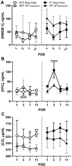 HMGB-1 (Figure 5A) and HYL (Figure 5B) showed minimal changes in DPT burn wounds regardless of infection; however, complement C3 was significantly reduced in DPT and trended low in FT burn wounds in the presence of S. aureus, relative to burn-only controls (Figure 5C). FT burn inoculated with S. aureus also exhibited elevated levels of HMGB-1 at all time points compared to burn-only. HYL was reduced in S. aureus infected FT burn wounds, being significantly lower at POD 3. These effects on HMGB-1 and HYL induced by S. aureus infection in FT burns were also seen in the 103 and 104 inoculums (Figure S5A,B). These S. aureus inoculum-dependent changes were also seen to govern the suppression of complement C3, which occurred at almost all time points for both DPT and FT burns for 104 and 105 inoculums (Figure 5C and Figure S5C).