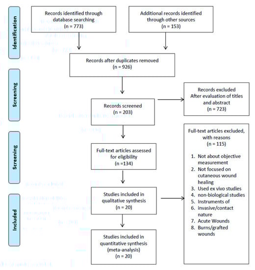 Seven hundred seventy-three articles were produced from the initial search, and an additional 153 were added when examining systematic reviews/metanalyses of a similar nature. In combination, a total of 926 articles were generated after duplications were removed. After filtering by reviewing titles and abstracts, 203 articles were chosen and 723 articles were excluded. Full articles were obtained, and a further 115 articles were removed after evaluating the full text. Reasons for this include not being about objective measurement, not being focused on cutaneous wound healing or that the study used ex vivo studies or non-biological studies, instruments of invasive/contact, acute wounds, burn wounds or grafted wounds. Thus, a total of 20 articles were selected in the final review. The selection process is outlined in Figure 1.