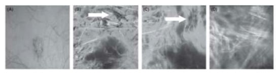 Morphological changes in acute wound healing; area of acute wound with crust and signs of inflammation (A); wound after curettage (B); reduced collagen matrix on visit (C); tight plexiform connective tissue densely packed collagen fiber bundles found in nearly regular arrangement in different orientations (D); minimal local connective tissue cells, connective tissue cells and basic substance, Reprinted with permission from ref. [16]. Springer, S. et al., 2017.
