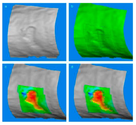 3D measurement of leg ulcer; (a) three-dimensionally measured surface; (b) approximation of the NURBS surface over the ulcer region; (c) visualization of ulcer depth variation using a rainbow color palette; (d) selection of the ulcer boundary. Reprinted with permission from ref. [30], Nada Kecelj-Leskovec et al., 2007.