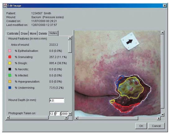 AMWIS 3D imaging Calibrated wound image, demarcated wound areas and the associated measurements expressed in mm and as percentages of the total wound surface area. Santamaria N. et al., 2002. [6].