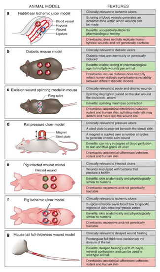 Animal models of wound healing clinical relevance, advantage and disadvantage. (a) Rabbit ear model. (b) Chemically induced type 2 diabetic mouse model. (c) Excision wound splinting model in mouse (dorsal view). (d) Rat magnet ischemiareperfusion model (profile view). (e) Pig wound infection model (dorsal view). (f) Pig flap ischemia model (dorsal view). This method is also applicable to rodents and rabbits. (g) Mouse tail fullthickness wound model (dorsal view). Nunan et al., 2014. [45].