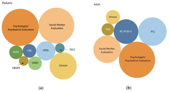The methods utilized for screening for stress disorder symptoms at the respondent’s institution are depicted. The area of the circle represents the number of respondents who selected the screening method as a way their institution screens for stress disorder symptoms. Respondents were able to select more than one method. (a) Pediatric screening tools: CTSQ—Child Trauma Screening Questionnaire; CROPS—Child Report of Post-Traumatic Symptoms; CBL—Child Behavior Checklist; CRIES—Child Impact of Events Scale; CPSS—Child PTSD Symptom Scale; TSCC—Trauma Symptom Checklist for Children (b) Adult screening tools: TSQ—Trauma Screening Questionnaire; PC-PTSD-5—Primary Care PTSD Screen for DSM-V; PCL—PTSD Checklist.