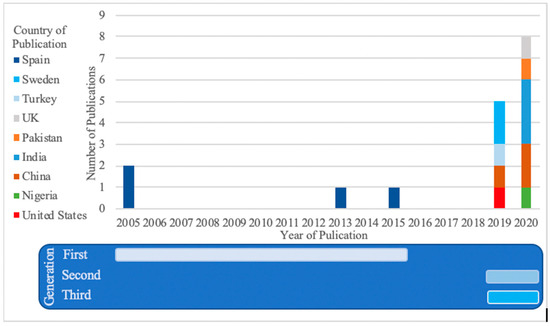 Figure 2 presents the selected articles according to their year and country of publication, split into three different methodological generations. The first generation includes four studies, all from a Spanish team, stretching over about 10 years [23,24,25,26]. Those studies all looked at the problem of assisted diagnosis (rather than a fully automated system, as in the latter generations), usually involving the characterization of specific features from experiments performed with burn experts, in order to replicate their diagnosing process. Fuzzy-ArtMap or Multidimensional Scaling Analyses were the methods used. The second generation, a cluster of four studies published in 2019 and 2020 from four countries, takes advantage of increased computational power and uses more advanced algorithm techniques (e.g., Support Vector Machine) [18,27,28,29]. This generation still requires that the images be pre-processed to feed the algorithm with image-specific features rather than images themselves. The third generation, introduced by teams from five different—and several new—countries, consists of studies from 2020 and 2021, which typically used transfer learning methodologies to increase the power of a small sample sizes of images, and which used as their inputs the whole images [16,17,30,31,32,33,34,35,36]. Indeed, the specificity of transfer learning is such that the fine-tuning of the algorithm can be performed using only a few burn images on an already existing CNN, previously trained on a colossal dataset of unrelated objects for a different task [37].