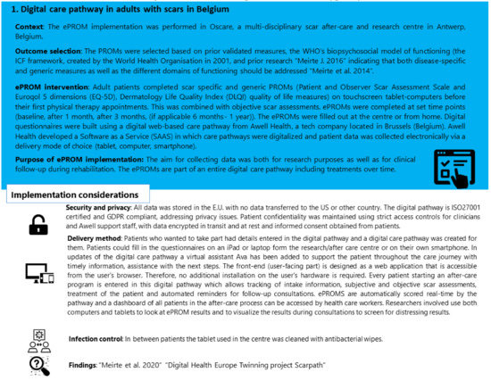 - Meirte, J.; Hellemans, N.; Anthonissen, M.; Denteneer, L.; Maertens, K.; Moortgat, P.; Van Daele, U. Benefits and Disadvantages of Electronic Patient-reported Outcome Measures: Systematic Review. JMIR Perioper. Med. 2020, 3, e15588. [Google Scholar] [CrossRef] [PubMed]