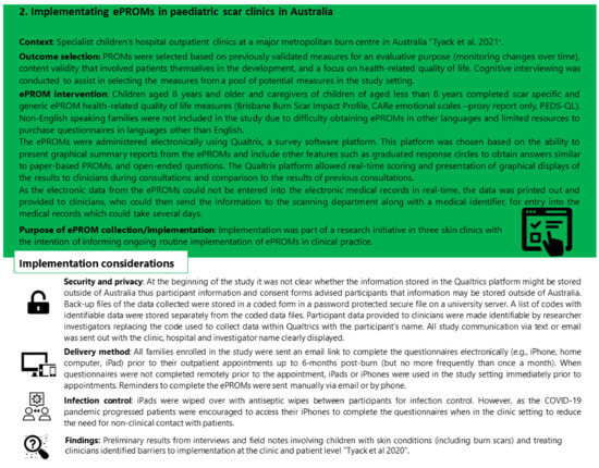 Chicago/Turabian StyleMeirte, Jill, and Zephanie Tyack. 2022. "Electronic Patient-Reported Outcome Measures in Burn Scar Rehabilitation: A Guide to Implementation and Evaluation" European Burn Journal 3, no. 2: 290-308. https://doi.org/10.3390/ebj3020025