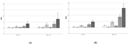 Using the cut-off point ≥ 5, 15 (25%) paediatric and 37 (30%) adult respondents, respectively, met this criterion. A cut-off ≥ 4 yields a proportion of 18 (37.5%) paediatric respondents who met this criterion of clinically relevant distress and 44 (48.4%) adult respondents. When using the DT cut-off ≥ 5 in relation to the total number of problems reported in every domain, Figure 1a (children) and Figure 1b (adults) show that respondents who score ≥5, report a higher number of problems compared to those scoring lower than five. However, in the paediatric subgroup, only physical problems were statistically significantly more frequently reported (t(46) = −2.59, p = 0.013), whereas in the adult subgroup, all domains excluding religious concerns, were statistically significant and more frequently reported (p-values < 0.01). This demonstrates that respondents who score ≥5 experience significantly more problems, particularly in the adult subgroup.