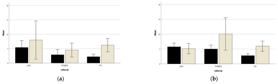 Bars representing mean DT scores and TBSA burned in relation to wish to discuss the problems (yes, maybe or not). Black bars represent mean DT scores, grey bars represent mean TBSA burned (a) Represents the result of the paediatric subgroup; (b) Represents the result of the adult subgroup.