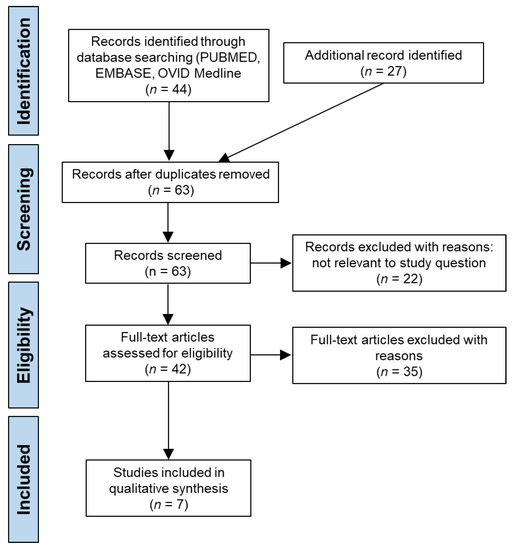 PubMed yielded 130 articles, of which 19 were selected for screening. Embase was searched through the Ovid interface and yielded 503 articles, of which 13 were selected for screening, and Medline yielded 399 articles, of which 20 were selected for screening. Google Scholar yielded 17,900 articles, a number of articles that was not practical to explore. However, the first 20 pages were investigated and resulted in the inclusion of 19 articles. The reference sections of the included articles were checked for any possible inclusions but resulted in no further articles. The full-text versions of all selected articles were screened, which resulted in the exclusion of 64 articles (eight were duplicates, 22 were not relevant to the research question, 33 did not include fluid resuscitation data, and one was not in English). Finally, only seven studies were selected as meeting all requirements and were included for further analysis in this systematic review [12,13,14,15,16,17,18].