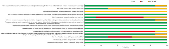 The NIH Quality Assessment Tool for Observational Cohort and Cross-Sectional Studies (https://www.nhlbi.nih.gov/health-topics/study-quality-assessment-tools, last accessed on 22 July 2022) was selected to assess the risk of bias of each study. The tool consisted of 14 questions to be answered with yes, no, or other (CD, cannot determine; NA, not applicable; NR, not reported) according to what was reported in each study. “Yes” was given a value of 1, while “no” and “other” were given a value of 0. Studies that scored a total of 0–5 were given a “poor” rating, 6–9 were considered “fair,” and 10–14 were rated as “good.” Both researchers involved in this review used the tool independently of each other. The results were then compared, and if there were any disagreements on the scoring, the matter was resolved by discussion.