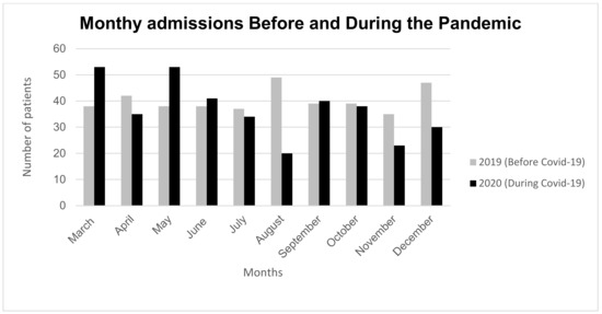 The rapid spread of the COVID-19 virus led to exceptional strategies which were adopted worldwide to limit the outbreak. Businesses considered to be non-essential were canceled, outdoor activities were limited, and social isolation was recommended [1]. The restrictions resulted in people mostly staying at home, leading to a potential increase in their exposure to domestic accidents, such as burn injuries [2]. In the state of Minas Gerais, Brazil, the first case of COVID-19 was confirmed on 8 March 2020, and the state of quarantine was declared on 18 March 2020. Furthermore, to reduce the spread of the virus, the authorities suggested the use of alcohol-based disinfectants, possibly increasing the risk of flame injuries [1,2]. However, while the rise of burn injuries during the outbreak was anecdotally reported by Brazilian physicians, but not verified [2,3], the increment of flame injuries caused by the external use of hand sanitizer, particularly affecting the arms and the trunk, was recently reported in Minas Gerais [4], suggesting that variations in epidemiological patterns were caused by changed behaviors. Understanding the impact of exceptional events, such as a pandemic, on burn injuries trends is indispensable in order to develop appropriate preventive strategies and to respond to a possible surge. However, it remains to be investigated whether the occurrence, cause, and severity of burns changed during the outbreak. For this reason, this study aimed to analyze possible differences in epidemiological trends in Brazil, comparing patients with burns admitted at the Burn Unit of Belo Horizonte, which is the main referral hospital of the state of Minas Gerais, before and during the pandemic.