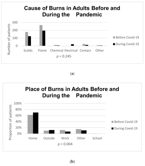 Table 1 shows a comparison between the study and control population. There was a difference in places where injuries happened, with fewer work-related and more domestic accidents during the pandemic compared with those admitted before (p < 0.05), whereas the age of patients, sex distribution, and causes of injuries remained unchanged. Referrals from other healthcare facilities to the Burn Unit decreased during the pandemic (p < 0.05), and so did the LOS (p = 0.014), while the time between injury and admission at the Burn Unit remained unchanged. During the outbreak, TBSA% diminished (p = 0.038), while the presence of full-thickness burns and of inhalation injuries did not (p = 0.415 and p = 0.812, respectively). Monthly burn admissions during the study period are shown in Figure 1. Pediatric burns comprised one-third of all admissions (n = 277). The most frequent causes of burns were scalds and flame injuries that occurred accidentally at home, both before and during the pandemic, as shown in Table 2. Among adults, there were differences in the place of injury and mechanism of injury before and during the pandemic (p = 0.002 and p = 0.037, respectively), whereas the causes of burns remained unchanged (p = 0.245), Figure 2a–c. In our study, domestic accidents increased in the study group during the pandemic, whereas work-related injuries remained unchanged (p = 0.245), Figure 2a–c.