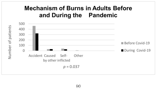 (a) Cause of Burns in Adults Before and During the Pandemic: comparison of adult burn patient cause and pandemic (before/during)—Fisher’s exact test, p-value = 0.245. (b) Mechanism of Burns in Adults Before and During the Pandemic. Mechanism of Burns in Adults, Before and During the Pandemic. Comparison of adult burn patient mechanism and pandemic (before/during)—Fisher’s exact test, p-value = 0.037. (c) Place of Burns in Adults, Before and During the Pandemic: comparison of adult burn patient place and pandemic (before/during) Chi-squared test, p-value = 0.002.