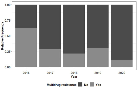 Barplot of the multidrug resistance relative frequency in function of year—Serratia marcescens.