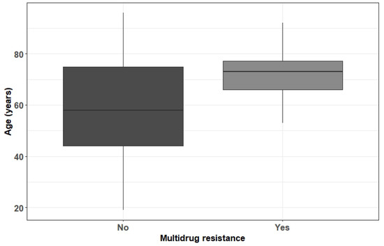Boxplot of the age in function of multidrug resistance—Staphylococcus aureus.