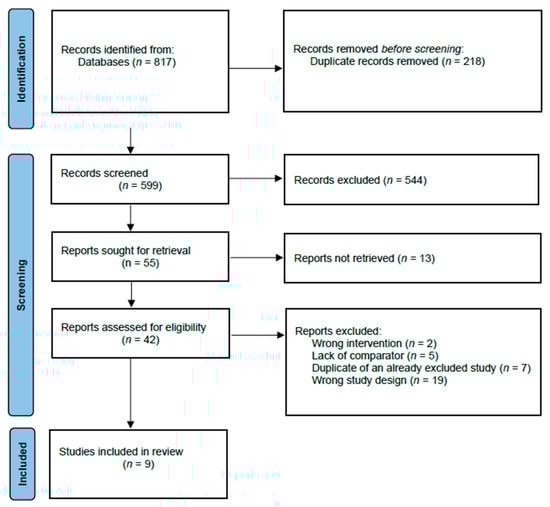 Our primary search of the literature identified 817 records. After the removal of duplicates, 599 records were assessed for inclusion by title and abstract screening. Of these, 55 reports were included for full-text screening, and of these, 46 reports were excluded. For 13 reports, no full text was available, and the authors of the reports were contacted by email or phone in an attempt to obtain data or a full-text article, but it was not possible to obtain the data, and they were excluded as well. Further, additional duplicates were found when full-text reading was completed due to variations in title and abstract in the records, leaving nine studies for inclusion in our review [,,,,,,,,] (Figure 1, Table 1). The kappa coefficient was 0.63 (0.51–0.74) for title and abstract screening and 0.93 (0.79–1.00) for full-text screening, indicating substantial agreement and almost perfect agreement, respectively.