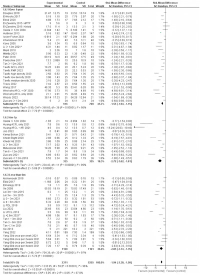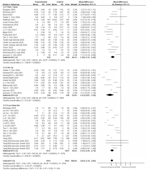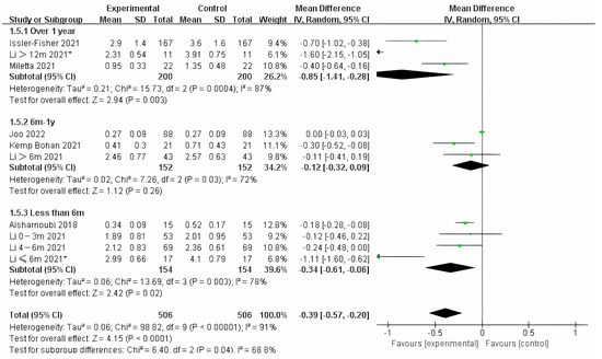 Consensus in China indicates that the length of immature scarring varies greatly between individuals and is dependent on a number of factors. Most scars reach maturity in 6–12 months, but the average immature period for hyperplastic scars can be 22–46 months [30]. As a result, to determine the best time to start treatment and the best method for scar treatment within one year, we analyzed relevant data by dividing the samples into the following groups: scarring for less than six months, scarring for six months to one year, and scarring for longer than one year. We used Review Manager 5.4 to calculate the std. mean difference (SMD) or weighted mean difference (WMD) with a 95% confidence interval (95% CI) for continuous outcomes. As substantial heterogeneity was identified, we used only the random-effects model. A p-value less than 0.05 was judged to be statistically significant.