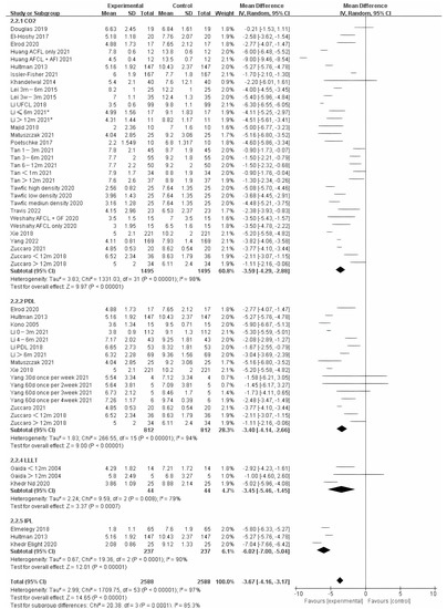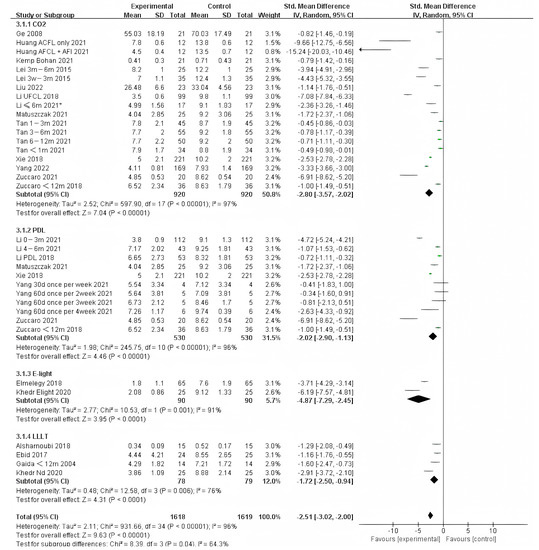We also analyzed the effects of different photo-electric therapies for all periods of burn scars. The results showed significant differences between the methods (Figure 5) (Chi² = 20.38, df = 3 (p = 0.0001), I² = 85.3%). Overall, therapies that included IPL were found to work best.