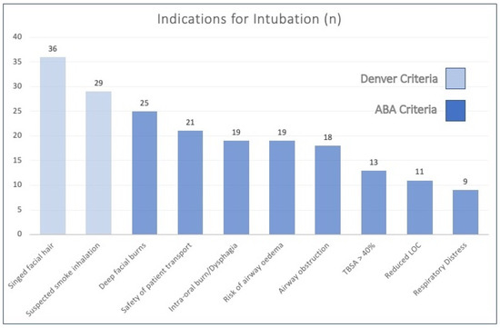 The most common indications for intubation were represented by the two Denver criteria (Figure 1)—namely singed facial hair in 65% (n = 36) of patients and suspected smoke inhalation present in 53% (n = 29). The most common ABA criteria was deep or full thickness facial burns, identified in 45% (n = 25) of cases as the reason for intubation.