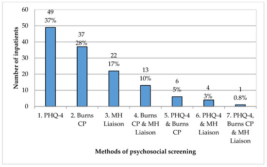 There were three methods of psychosocial screening completed: a PHQ-4 questionnaire administered by nursing staff, direct interview with the burns clinical psychologist and direct interview with the mental health liaison service. Additionally, there were instances when multiple methods of screening were completed. Figure 1 shows the combinations of methods of screening completed. Overall, 83 (63%) inpatients were screened by direct interview by the burns clinical psychologist and/or the mental health liaison service. Screenings completed by the mental health liaison service included 14 inpatients who had presented with burns sustained by deliberate self-harm.