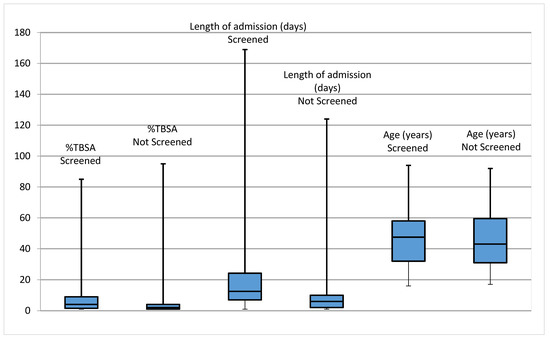 Medians and IQR of %TBSA, length of admission and age for those screened and those not screened.