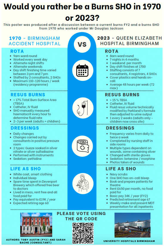 The life of a resident doctor (equivalent to Senior House Officer, SHO or Foundation Year 2, FY2) in one UK-based burns service in 1970 was explored through a first-hand account with a resident doctor of that time. This information was fact checked with a literature review. A contrast was then made with life today in the same unit, and information presented to medical staff within the burns centre in the form of a poster. The question was posed: “Would you rather be a burns SHO in 1970 or now?” By exploring the working conditions of the past, and assessing current burns clinicians’ attitudes to the changing workplace, we aimed to glean greater insight into our unique history, but also to explore the present attitudes toward work, and perhaps where the direction of travel may be for future working conditions.