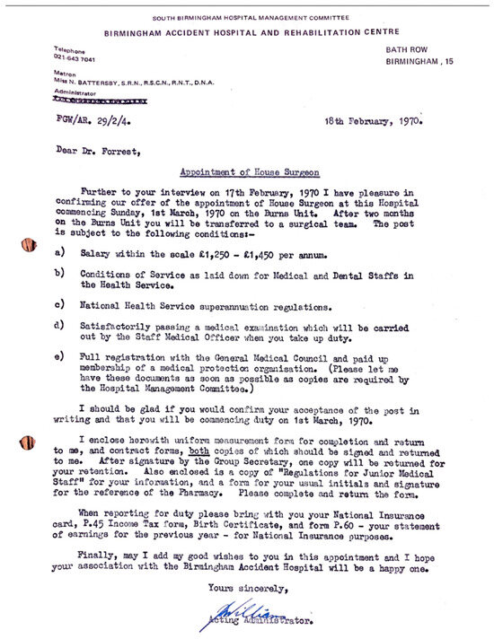 The interview begins with the lament: “The world has b****y changed…”. In 1970, the world did indeed look very different: just the year prior, man had first walked on the moon and Concorde took its first test flight. In early 1970, the interviewee, then in his 20s, began his three month burns rotation as one of two “house surgeons” for Mr. Douglas MacGregor Jackson and Mr. Jack Cason, the only two appointed consultants at the 30-bed Birmingham Accident Hospital burns unit. With no registrars, he directly reported to them. He describes his average working week.