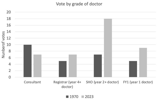 n = 41) for 2023. The majority of consultants (59%) voted for 1970. In contrast, the majority of registrars (58%), SHOs (72%) and FY1s (64%) voted for 2023 (