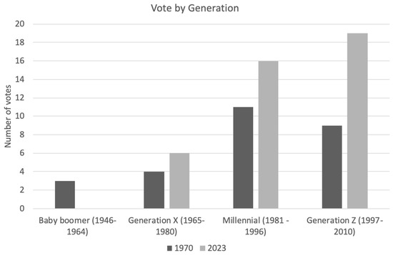The mean age of voter for 1970 vs. 2023 was 37 years versus 31 years, respectively (
