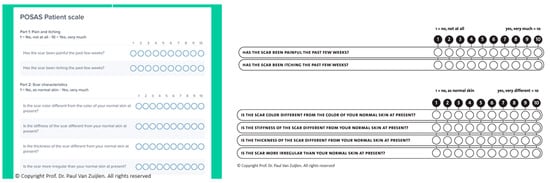- Draaijers, L.J.; Tempelman, F.R.; Botman, Y.A.; Tuinebreijer, W.E.; Middelkoop, E.; Kreis, R.W.; Van Zuijlen, P.P. The patient and observer scar assessment scale: A reliable and feasible tool for scar evaluation. Plast. Reconstr. Surg. 2004, 113, 1960–1965; discussion 1966–1967. [Google Scholar] [CrossRef]