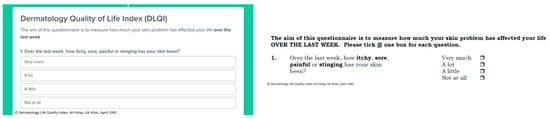 - Ali, F.M.; Johns, N.; Finlay, A.Y.; Salek, M.S.; Piguet, V. Comparison of the paper-based and electronic versions of the Dermatology Life Quality Index: Evidence of equivalence. Br. J. Dermatol. 2017, 177, 1306–1315. [Google Scholar] [CrossRef]