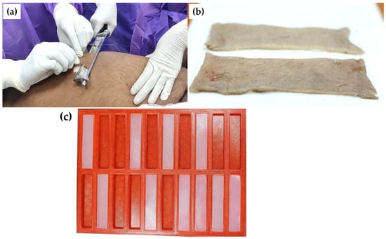 Fresh human cadaveric skin was collected from the Department of Forensic Sciences at the All India Institute of Medical Sciences (AIIMS) in Delhi, India (Figure 1). Two cadaveric bodies aged 18 years and 36 years (both male) were used for the sample collection with written consent from the family members of both individuals for the skin collection as per the ethical norms (IEC-138/11.04.2023). From both the cadaveric bodies, samples with a size of 55 × 55 × 1.5 (in mm) were collected from the thigh regions using dermatone. The excised skin samples were stored in a physiological saline solution at a refrigeration temperature of 4 °C to maintain the hydration and properties of the natural skin [20]. Each cadaveric skin sample was divided into five test coupons of size 50 × 10 × 1.5 (in mm) and tested under uniaxial tensile loading within 12 h of the sample collection to maintain the realistic mechanical properties of the human skin.