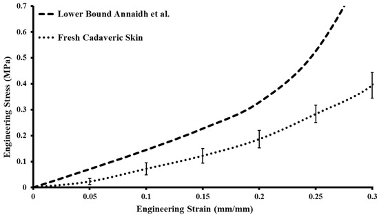 Stress–strain plot of fresh cadaveric skin compared with the lower bound from the literature [28].