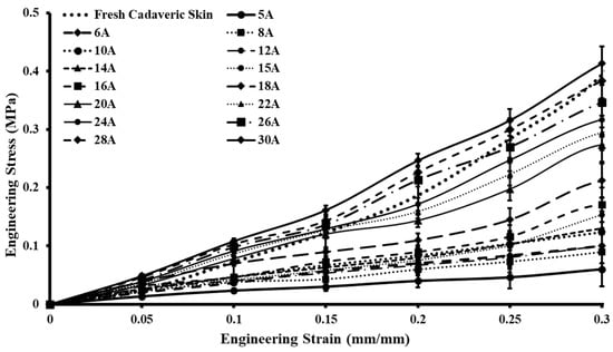 The uniaxial tensile tests were performed on 15 skin simulant samples with varying Shore hardnesses (5A–30A) at a strain rate of 0.4 mm/s (24 mm/min), which was similar to uniaxial testing on fresh cadaveric human skin. The plots of the tested samples for the skin tissue simulants were compared with the cadaveric samples of fresh skin tested. The stress vs. strain graphs were created utilizing the average stress values of each test sample (i.e., 5A–30A) coupled with the standard deviation error bars (Figure 4). To ensure the reliability of the tensile tests, three samples of each Shore hardness (5A–30A) were fabricated and tested. It was found that the highest stress values at 30% strain for 30A simulants were 0.413 ± 0.0295 MPa, and the lowest value was recorded for the 5A simulants, i.e., 0.06 ± 0.007 MPa. The simulants with Shore hardnesses of 5A–24A were found under the bound of fresh cadaveric skin (Figure 4), and the simulants with Shore hardnesses of 20A, 22A, and 24A closely mimicked the stress–strain plot of fresh cadaveric skin. It should be mentioned that the silicone-based polymeric composition of the simulant samples did not break in the same way as that of actual human skin. However, it did show ultimate tensile stress values similar to those of human skin [28]. The study revealed that stress values were directly associated with the Shore hardness of the developed test coupon, i.e., as the Shore hardness increases, so does the stress value.