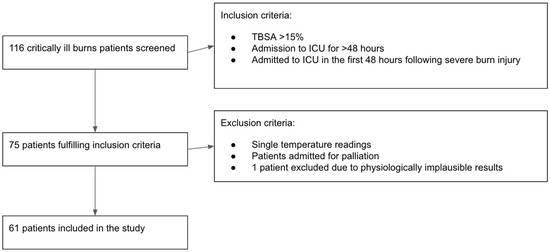 Patients who had sustained a total body surface area (TBSA) burn injury of greater than 15% and were admitted to the ICU for at least 48 h were included in the analysis. Patients admitted to the ICU for palliation, or those who did not have concurrent core and peripheral temperature measurement recordings were excluded. One patient’s observations were further excluded due to physiologically implausible results, attributed to a technical error in the measurement. Sixty-one patients met these criteria, and their data, recorded on the hospital’s electronic system (PICS—Prescribing Information and Communication System, Birmingham, UK), were retrospectively analysed (Figure 1).
