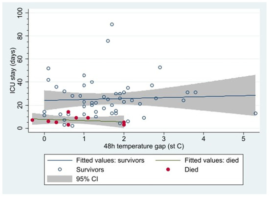 Nine patients died whilst in ICU; all of them had a core-peripheral gap < 2 °C at 48 h. It is worth noting that the survivors had a higher mean 48 h gap (1.6 [95%CI: 1.3 to 1.9] compared to non-survivors 0.8 [0.2 to 1.4]; p = 0.04) (Figure 2).