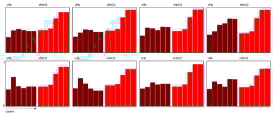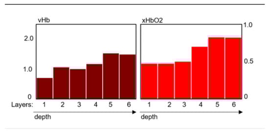 For the specific information retrieval, a 6-layer model of the skin/wound and an approximate solution process for the inverse problem (calculation of the system parameter from the remission spectra) were developed, which allows for the calculation of so-called perfusion profiles [18]. These profiles consist of the two components volume part (vHb) and oxygen saturation (xHbO2) of the hemoglobin for each of the layers. This inverse procedure does not allow for an exact determination of the actual layer depths, so the profiles are accordingly presented as a series of bars with equal width (Figure 1):