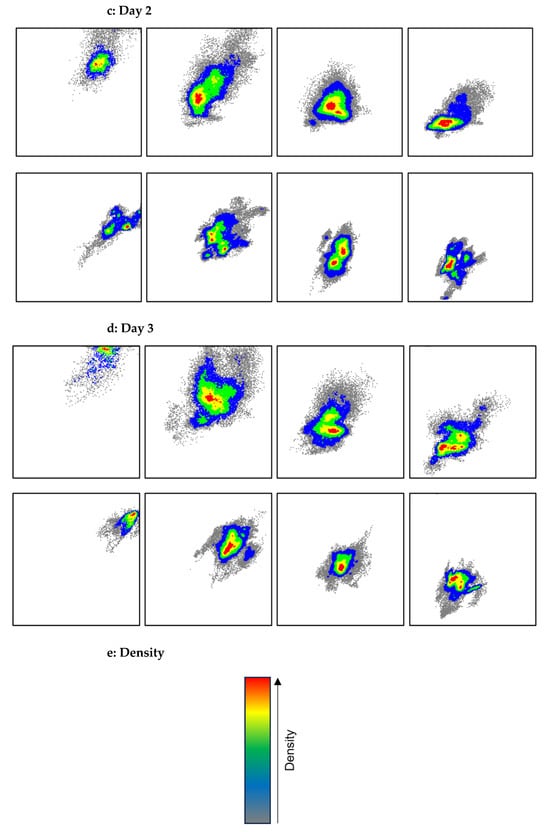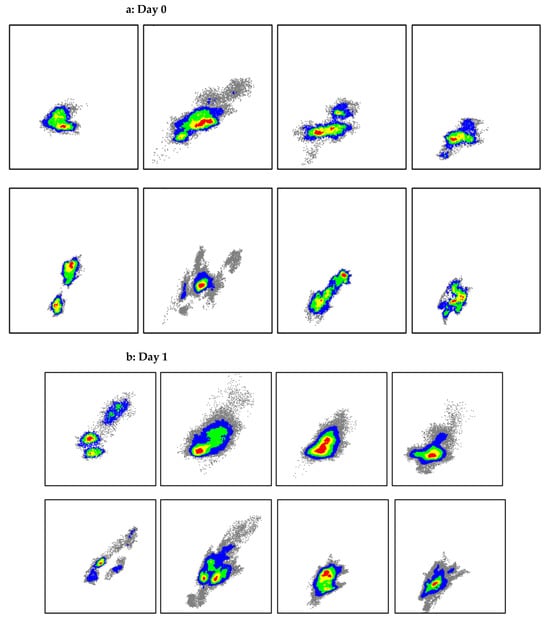 - Initially, on day 0, a compact global distribution in the lower left area of the parameter space with strongly overlapping classes; in the following days the distribution subsequently spreads towards the upper right area with reduced overlaps of the classes (increased class discrimination).