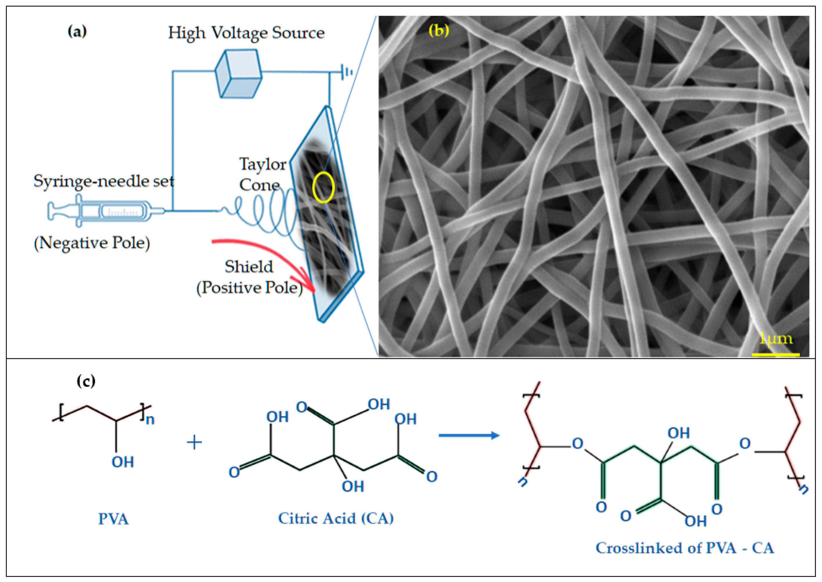 Figure 1c is a custom illustration designed by the authors using the BioRender software (2025) using free images, highlighting the role of citric acid (CA) as a crosslinking agent. CA interacts with PVA’s hydroxyl groups (-OH) through its carboxylic acid groups, forming ester bonds during heating [
